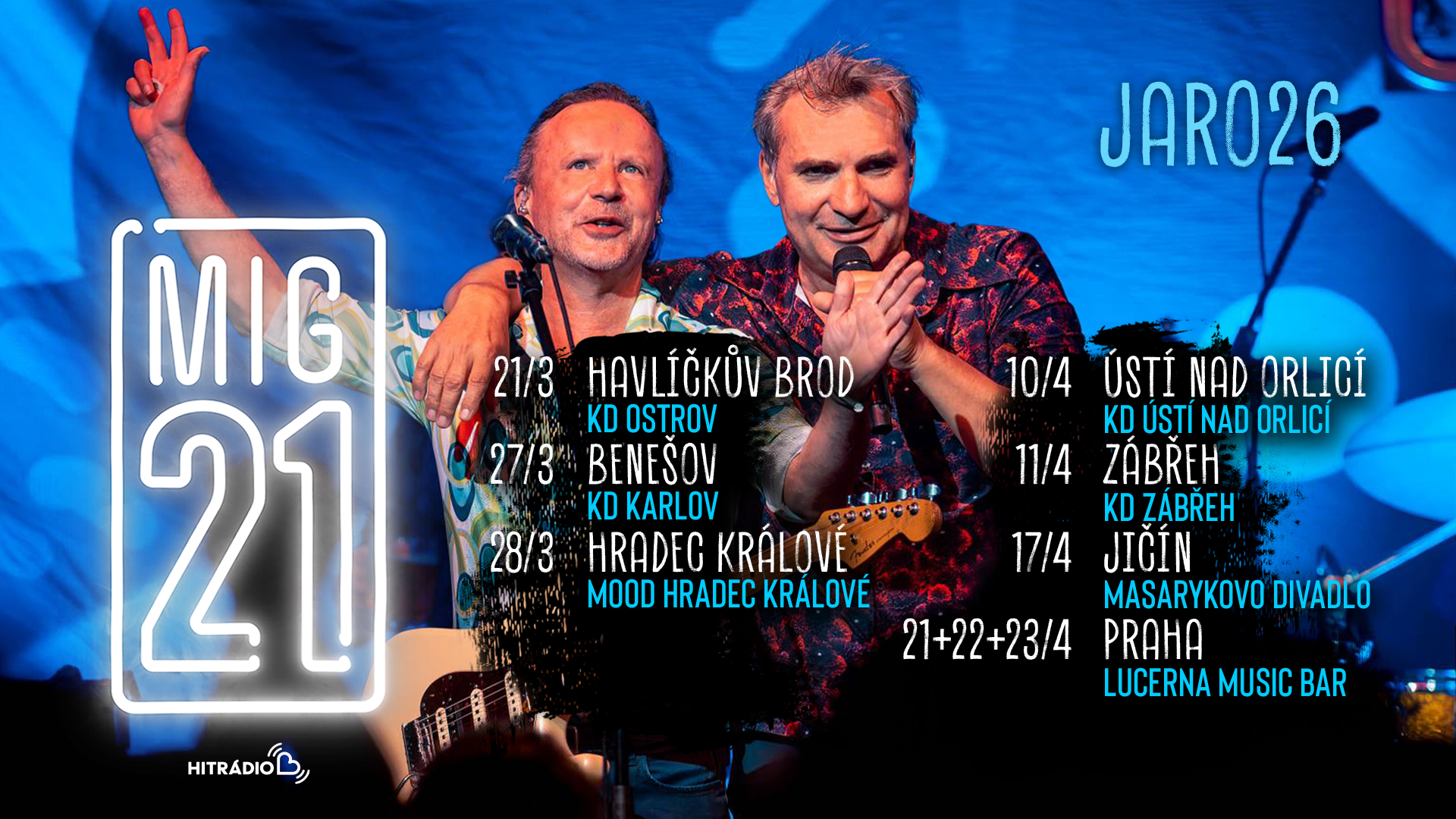 „JARO 26“ startuje 21. března v Havlíčkově Brodě, bude pokračovat přes Benešov, Hradec Králové, Ústí nad Orlicí, Zábřeh, Jičín a skončí třemi koncerty v pražském Lucerna Music Baru 21., 22. a 23. dubna.